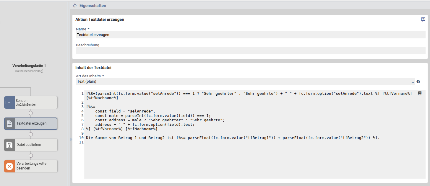 [%$=(parseInt(fc.form.value("selAnrede")) === 1 ? "Sehr geehrter" : "Sehr geehrte") + " " + fc.form.option("selAnrede").text %] [%tfVorname%] [%tfNachname%]Zusätzlich zur value()-Funktion kann bei Auswahlfeldern (select-Elemente) über die Funktion option() gegangen werden, um den Text des ausgewählten Elements zu erhalten.