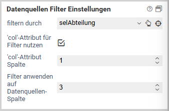 Im Beispiel wird durch das Element selAbteilung die CSV-Datenquelle Abteilung referenziert. Als Filter-Parameter ist die Id der Abteilung zu verwenden. Diese ist in der CSV-Datenquelle in Spalte 1 hinterlegt. - Filter anwenden auf Datenquellen-Spalte: Diese Option ist nur dann verfügbar, wenn es sich bei der angebundenen Datenquelle, um eine CSV-Datenqelle handelt. Anders als bei Datenbank-Abfragen, wo die definierte Abfrage die Verwendung des Filter-Parameters definiert, gibt es dies bei der Anbindung von CSV-Datenquellen nicht. Deshalb muss an dieser Stelle die Spalte in der zugrundeliegenden CSV-Datenquelle definiert werden, auf die der Filter-Parameter angewendet wird.