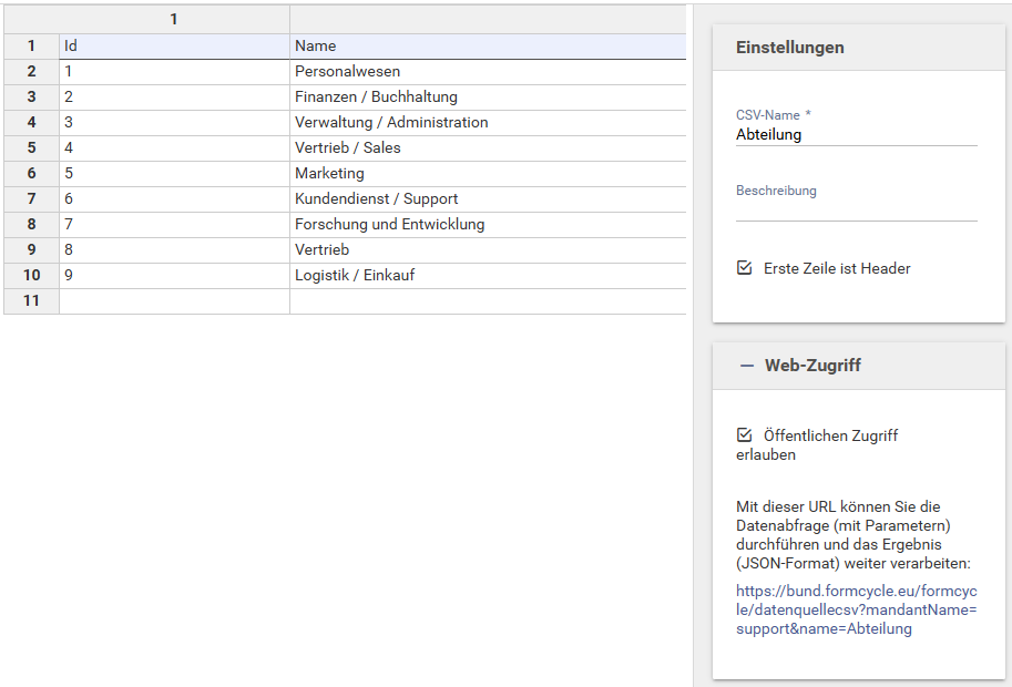 - Datenquelle: Definiert die anzubindende Datenquelle. Im Beispiel die CSV-Datenquelle Abteilung.