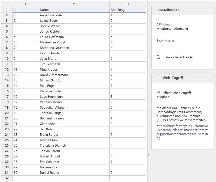 - Abteilung: Die Id der Abteilung, welcher der Mitarbeiter zugeordnet ist. (Referenziert auf die Id der ersten CSV-Datenquelle Abteilung)