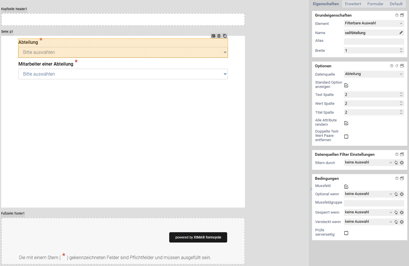 - filtern durch: Definiert ein Formularelement welches den Wert für eine Filterung liefert. Im Beispiel ist dies das Element selAbteilung und dessen aktuell durch einen Nutzer ausgewählte Option.