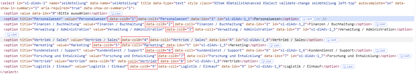 Im Beispiel wird ein 'col'-Attribut genutzt, da dort die notwendige Id der Abteilung abgebildet wird, während der Wert der Auswahl-Option die Bezeichnung der Abteilung enthält, welche als Filter-Parameter nicht dienen kann.
