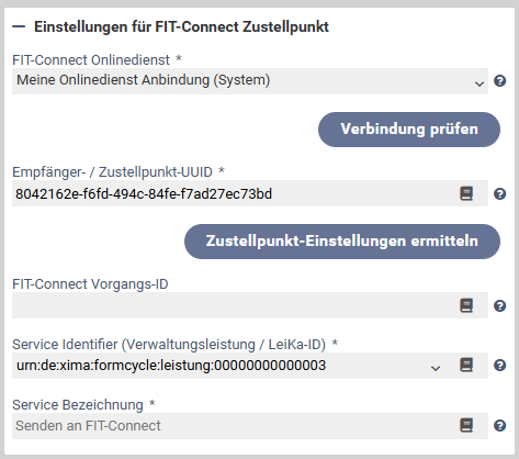 lässt sich prüfen, ob mit dem ausgewählten Onlinedienst eine Verbindung zu FIT-Connect hergestellt werden kann. - Empfänger- / Zustellpunkt-UUID (Pflichtangabe): Ein Identifier der den Empfänger der Nachricht in FIT-Connect eindeutig referenziert (Angabe in Form einer UUID: 00000000-0000-0000-0000-000000000000).