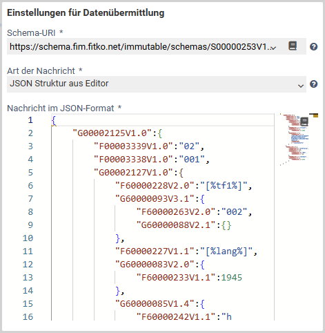 Wenn dieses Feld durch eine Zustellpunkt-Abfrage und anschließender Auswahl eines konkreten Service Identifiers befüllt wurde, so stehen hier nur noch die von der Verwaltungsleistung unterstützen Nachrichten-Arten, JSON oder XML, zur Auswahl. - Nachricht im JSON / XML - Format (Pflichtangabe): Im eingeblendeten Editor muss, je nach der zuvor festgelegten Nachrichten - Art (JSON oder XML) eine entsprechende Datenstruktur angelegt werden. Dabei können Platzhalter verwendet werden. Zum Ausführungszeitpunkt der Plugin-Aktion wird die erzeugte Nachricht (mit ersetzten Platzhaltern) grundsätzlich in Hinblick auf den festgelegten Nachrichten-Typ (JSON oder XML) hin, geprüft. Wenn diese Prüfung fehlschlägt, so wird die Plugin-Verarbeitung mit dem Fehlercode PARAMETER_FORMAT_ERROR beendet.