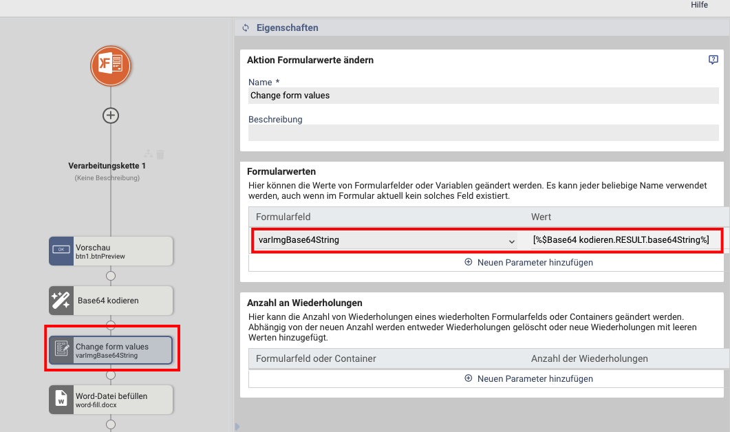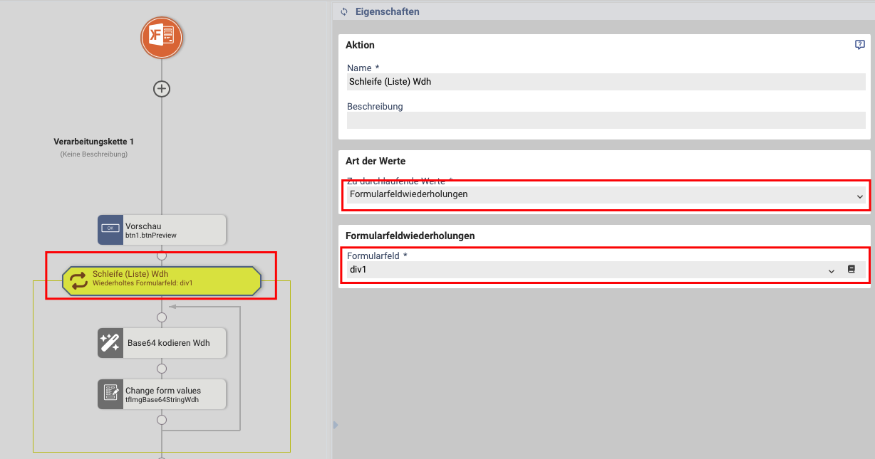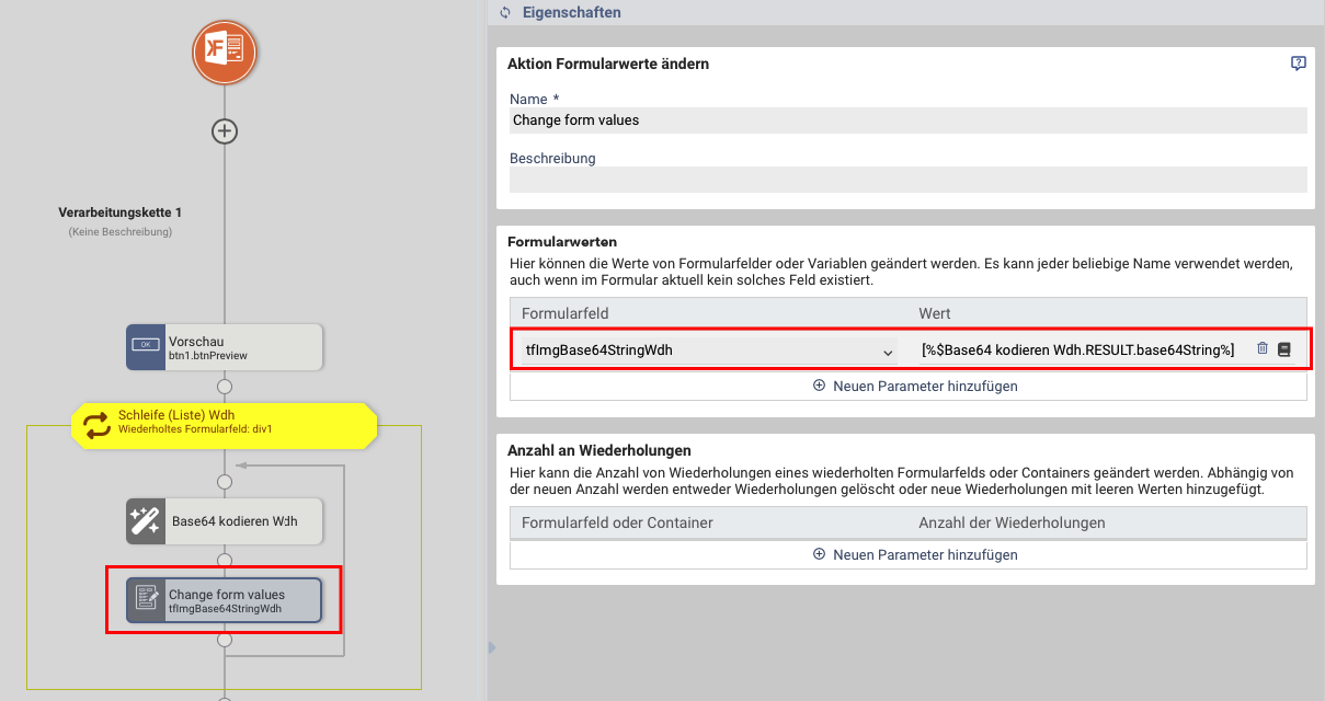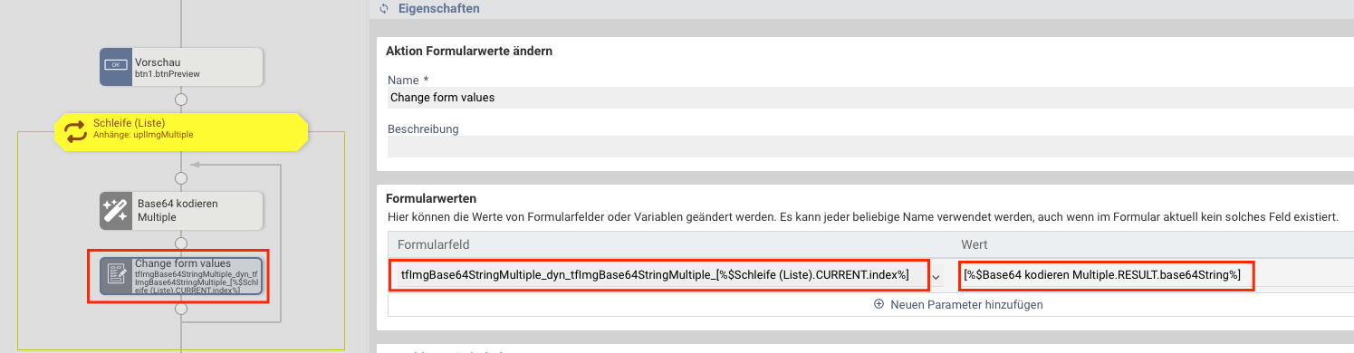 3.) Erstellen Sie danach, auch in der Schleife, eine Aktion "Formularwerte ändern" und schreiben den Base64String (Rückgabewert der Aktion Base64 kodieren) in das versteckte Feld "tfImgBase64StringWdh".