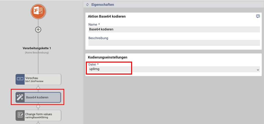 2.) Erstellen Sie danach eine Aktion "Formularwerte ändern" und schreiben den Base64String (Rückgabewert der Aktion Base64 kodieren) in die Variable "varImgBase64String".