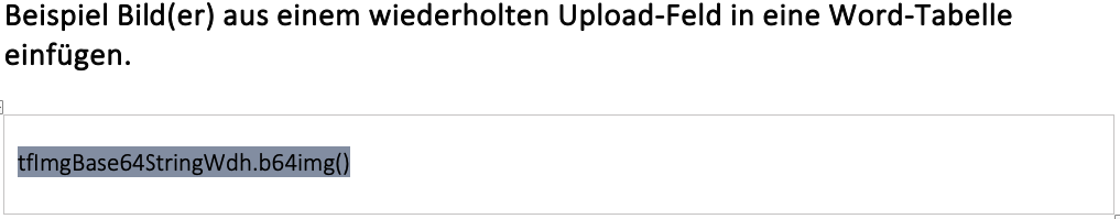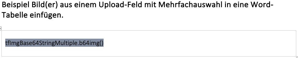 Bereiten Sie das Word-Dokument vor und fügen Sie ein Feld/Platzhalter mit dem Namen ein (z.B. "tfImgBase64StringMultiple"). Um das Bild anzuzeigen, ist die Funktion "b64img()" notwendig. Der Platzhalter im Word sollte dann z.B.