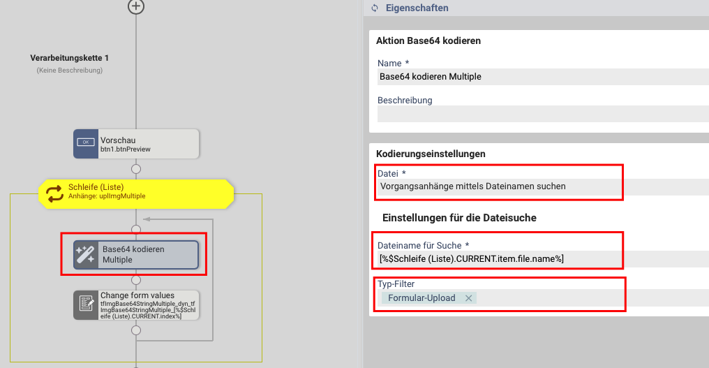 2.) Erstellen Sie in der Schleife eine Aktion "Base64 kodieren" und wählen "Vorgangsanhänge mittels Dateinamen suchen" aus. Bei "Dateiname für Suche" wählen Sie über den Platzhaltermanager der aktuellen Schleife den Dateinamen aus. Dies erfolgt dann über den Platzhalter: [%$Schleife (Liste).CURRENT.item.file.name%]