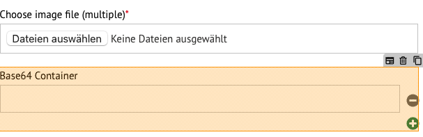 Erzeugen Sie ein verstecktes Feld in dem später der Base64 String abgespeichert wird. Dieses Feld muss wiederholbar sein! In unserem Beispiel ist das wiederholbare versteckte Element "tfImgBase64StringMultiple". Bitte beachten sie, dass nur das versteckte Feld wiederholbar sein muss. Das Upload-Feld ist nicht wiederholbar!