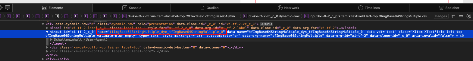 - 4.) Kopieren Sie sich den Werte vom Attribut "name". In diesen Fall: tfImgBase64StringMultiple_dyn_tfImgBase64StringMultiple_0
