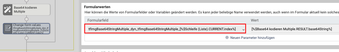 3.) Erstellen Sie danach, auch in der Schleife, eine Aktion "Formularwerte ändern" und schreiben den Base64String (Rückgabewert der Aktion Base64 kodieren) in das versteckte Feld. Bei "multiple" Upload ist das zu beschreibende Formularfeld (Base64 Container) allerdings nicht der technische Name des Designers. Hier muss der Name über einen "Trick" herausgefunden werden.