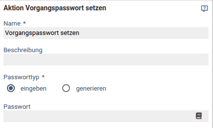 Mit der Aktion Vorgangspasswort setzen wird einem Vorgang ein Passwort zugewiesen. Dieses Passwort ermöglicht es berechtigten Personen, über einen Prozess-Link erneut auf einen bereits eingereichten Vorgang zuzugreifen.