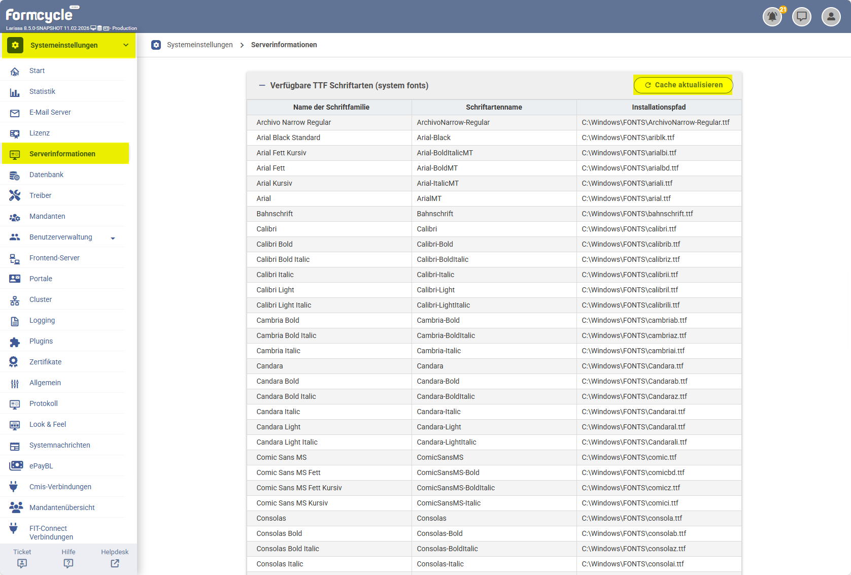 Nach der Installation einer Schriftart unter Windows auf dem Server erscheint diese nicht in der Liste der installierten Schriftarten unter den Serverinformationen. Selbst ein Neustart des Tomcats hat keine Auswirkungen. Den Cache zu aktualisieren brachte ebenfalls keine Änderung.