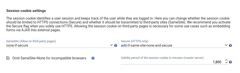 The session cookie identifies a user session and keeps track of the user while they are logged in. Here you can change whether the session cookie should be limited to HTTPS connections (Secure) and whether it should be transmitted to third-party sites (SameSite). We recommend you activate the Secure flag when you solely use HTTPS. Allowing the session cookie on third-party pages is necessary for some use cases such as embedding forms via AJAX into external pages.