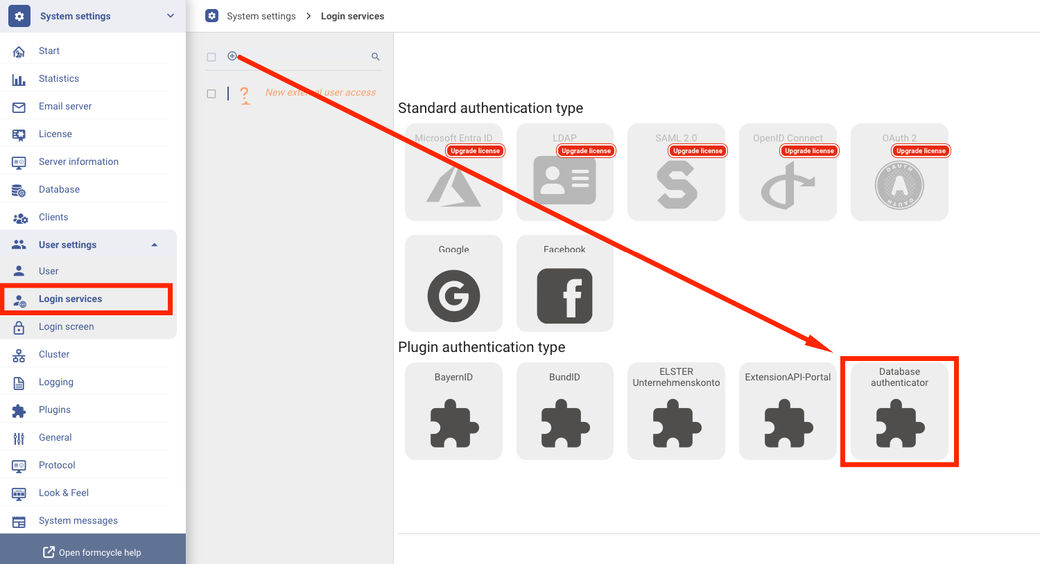 After installing the plugin, the new type "Database authenticator" is available under User settings > Login services.